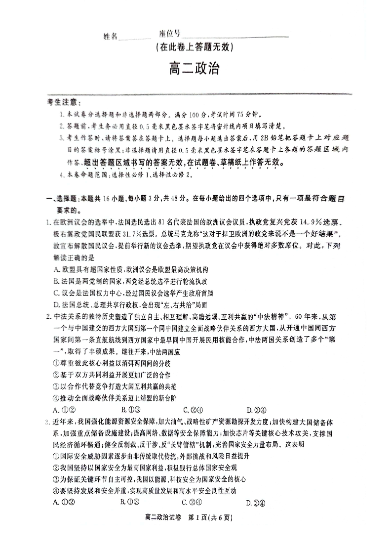 安徽省亳州市2023-2024学年高二下学期7月期末考试 政治
