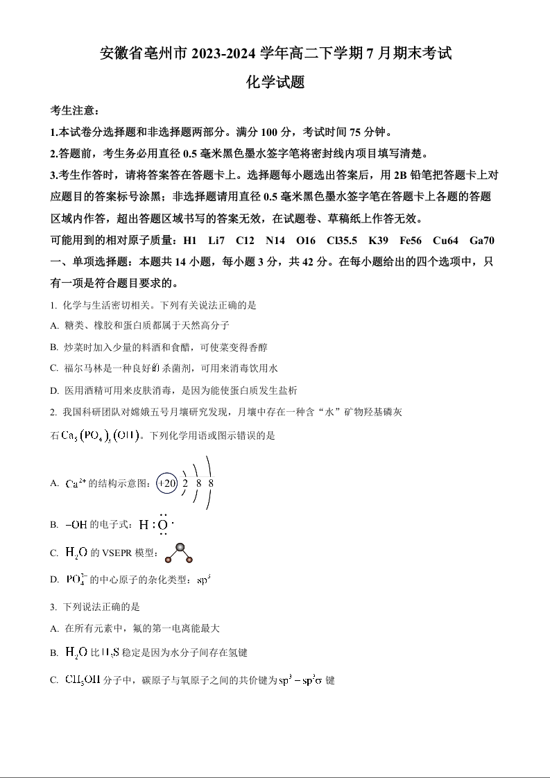 安徽省亳州市2023-2024学年高二下学期7月期末考试 化学