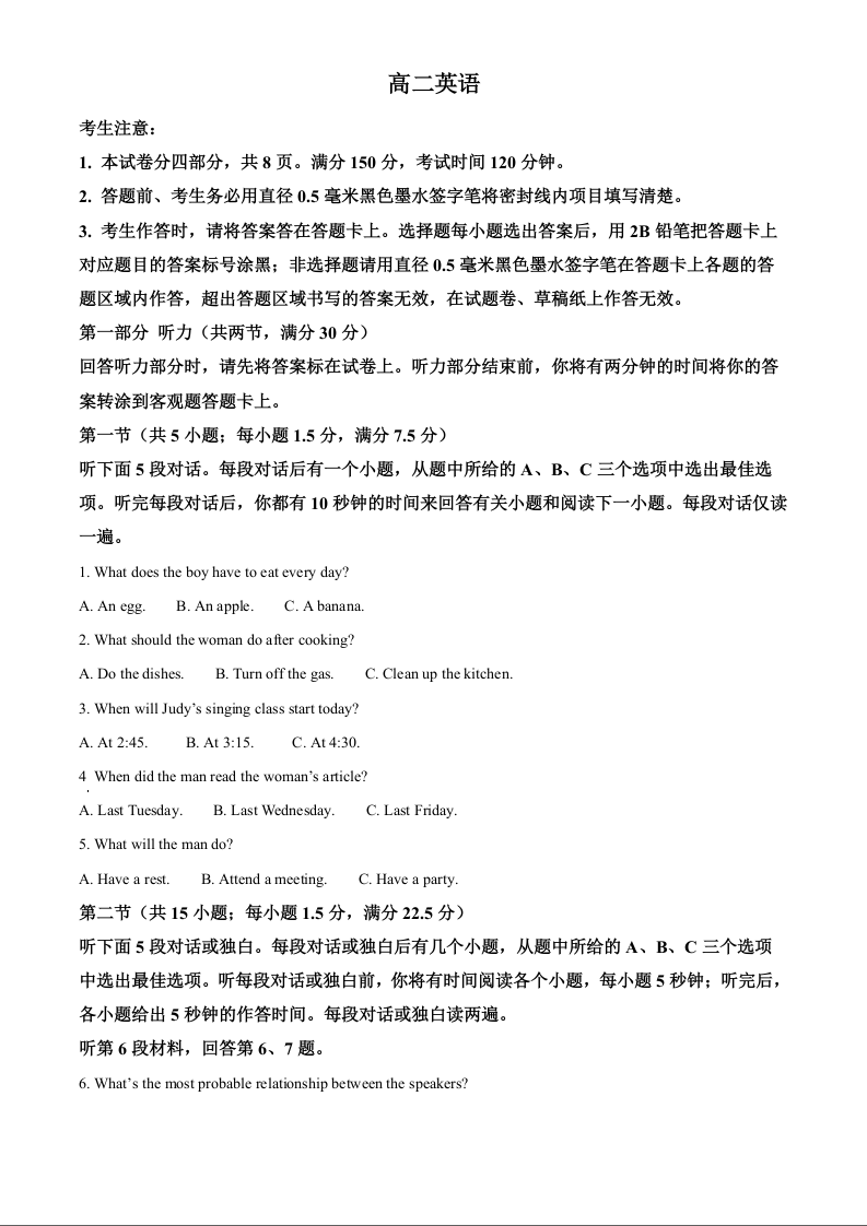 安徽省亳州市2023-2024学年高二下学期7月期末考试 英语