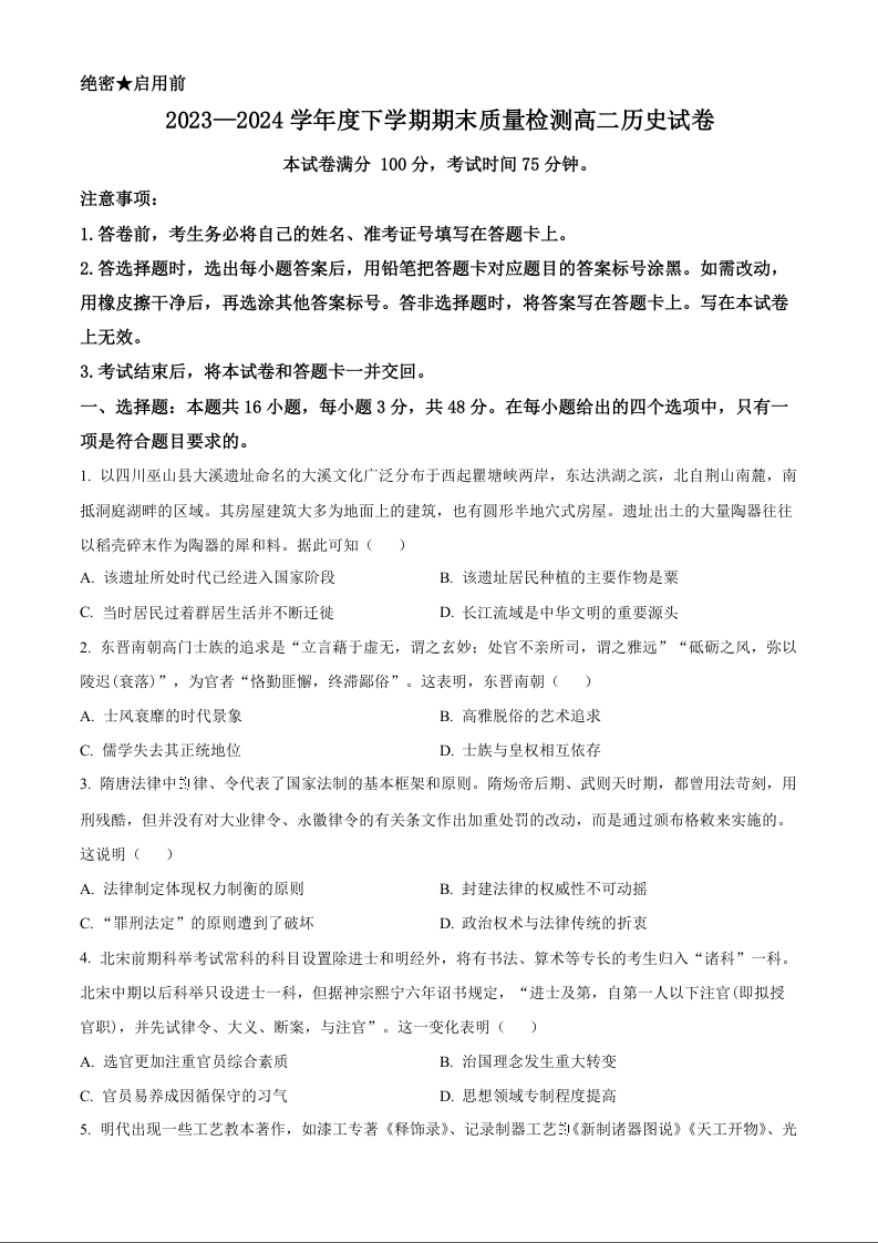 辽宁省本溪市县级重点高中协作体2023-2024学年高二下学期7月期末考试 历史