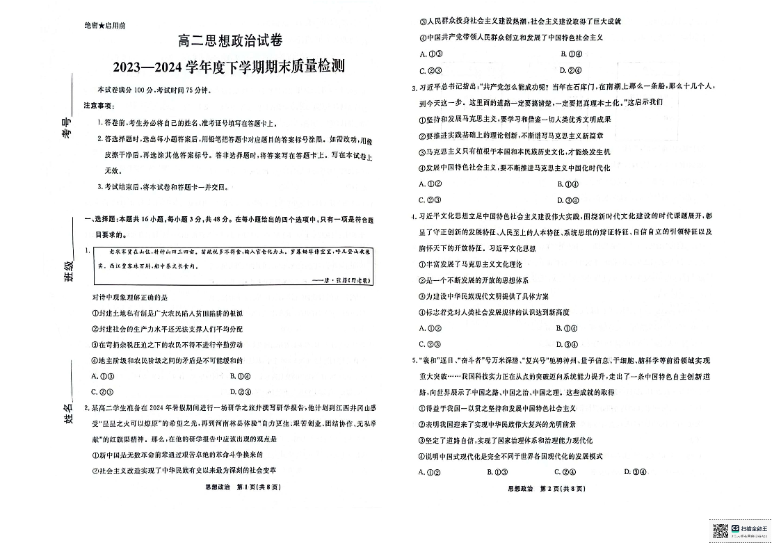 辽宁省本溪市县级重点高中协作体2023-2024学年高二下学期7月期末考试 政治