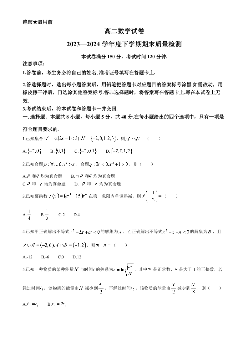 辽宁省本溪市县级重点高中协作体2023-2024学年高二下学期7月期末考试 数学