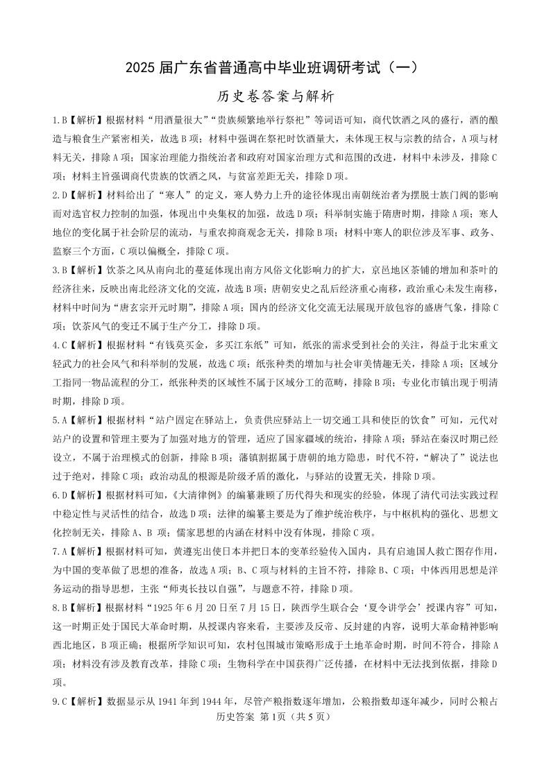 广东省高考研究会:2025届广东省普通高中毕业班调研考试(一)历史答案