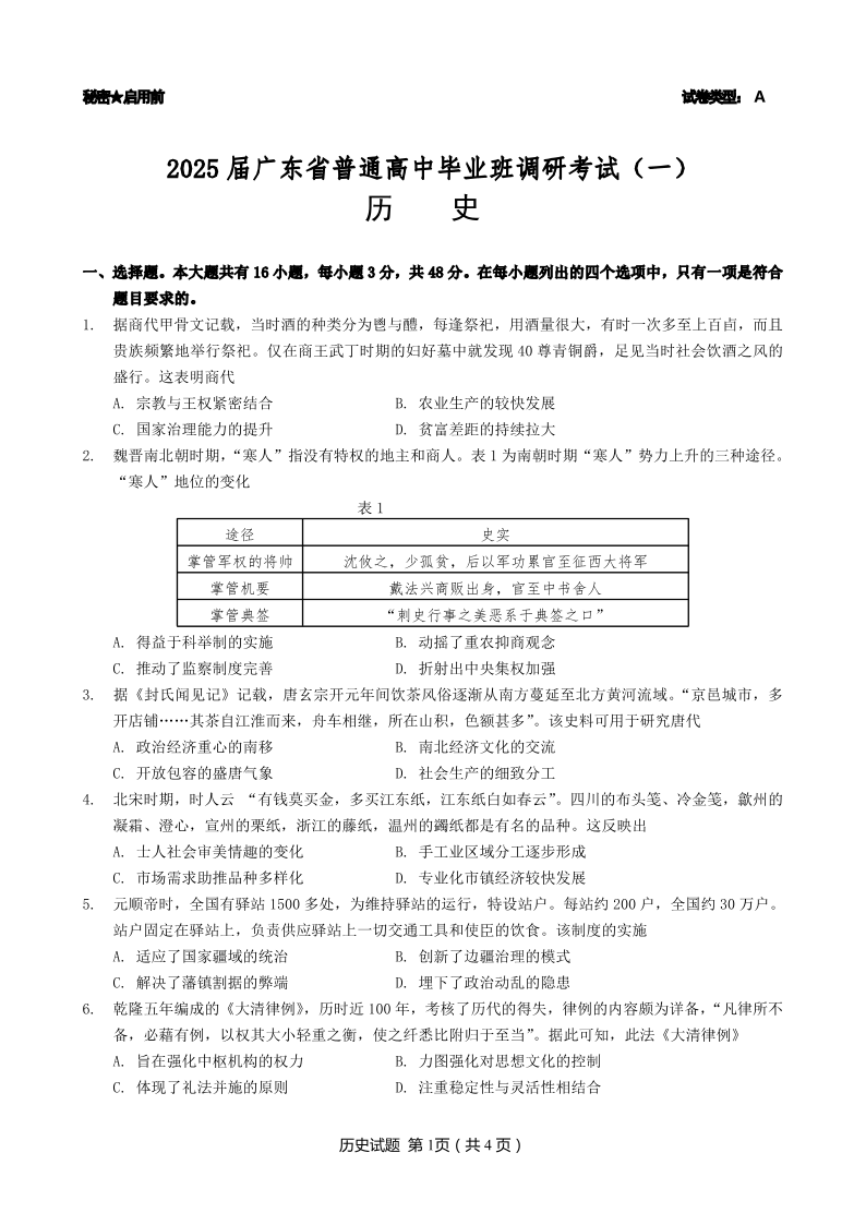 广东省高考研究会:2025届广东省普通高中毕业班调研考试(一)历史