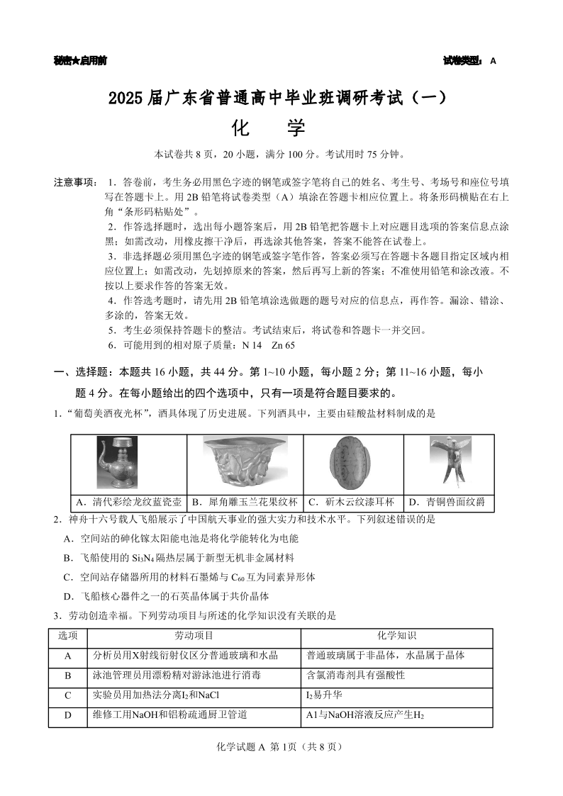 广东省高考研究会:2025届广东省普通高中毕业班调研考试(一)化学