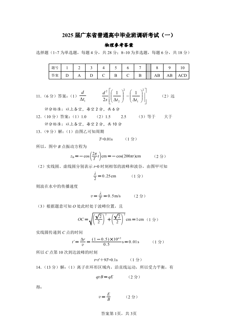广东省高考研究会:2025届广东省普通高中毕业班调研考试(一)物理答案