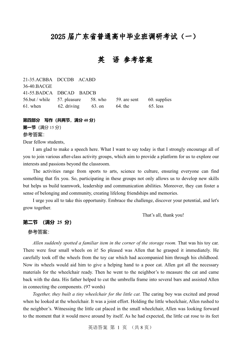 广东省高考研究会:2025届广东省普通高中毕业班调研考试(一)英语答案