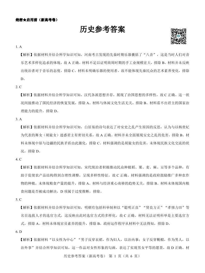 名校教研联盟2024届高三上学期开学考试 历史参考答案