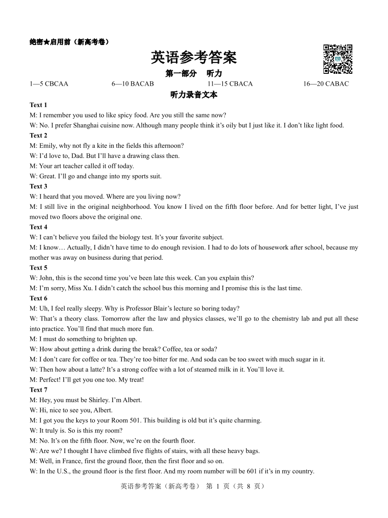 名校教研联盟2024届高三上学期开学考试 英语参考答案