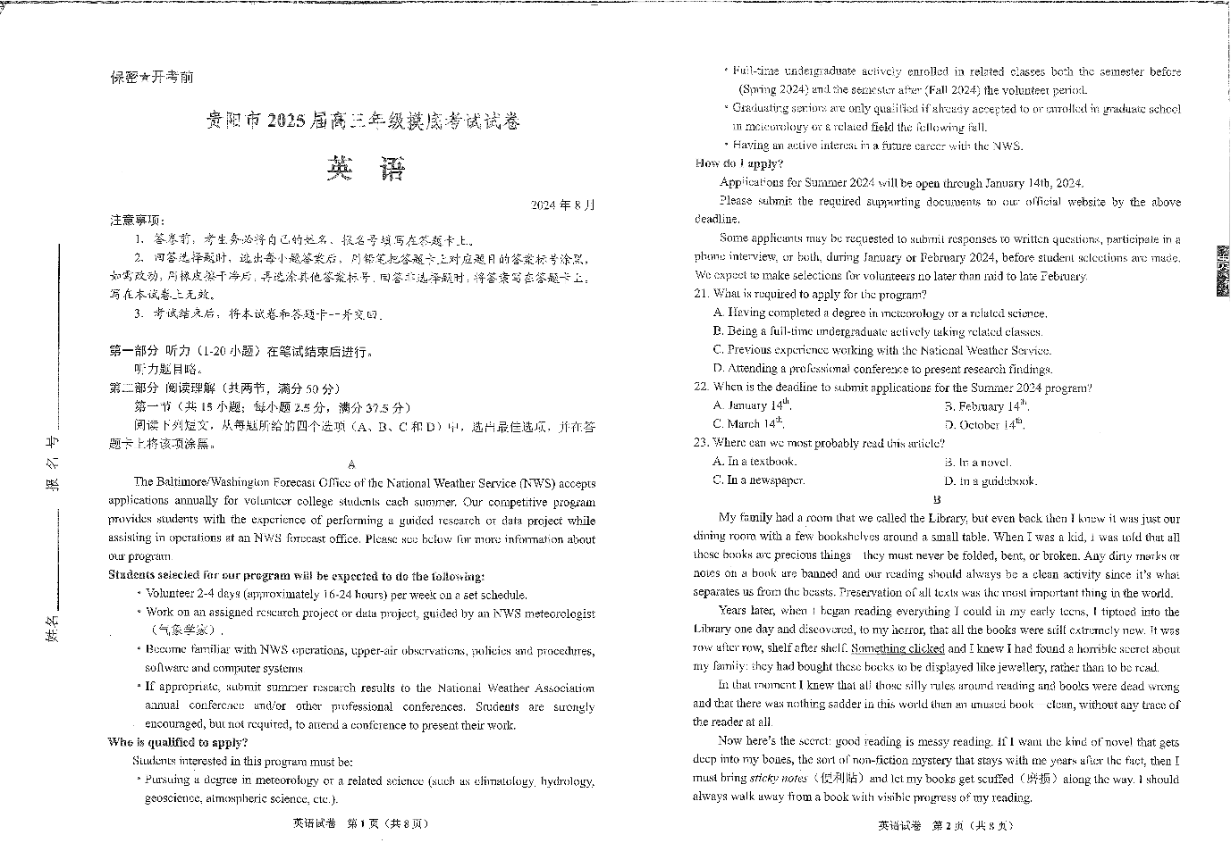 贵州省贵阳市2025届高三年级8月摸底考试 英语