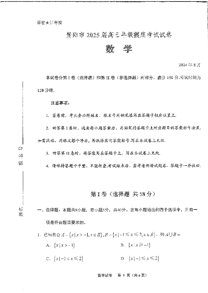 贵州省贵阳市2025届高三年级8月摸底考试 数学