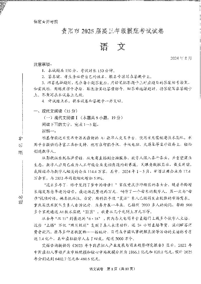贵州省贵阳市2025届高三年级8月摸底考试 语文