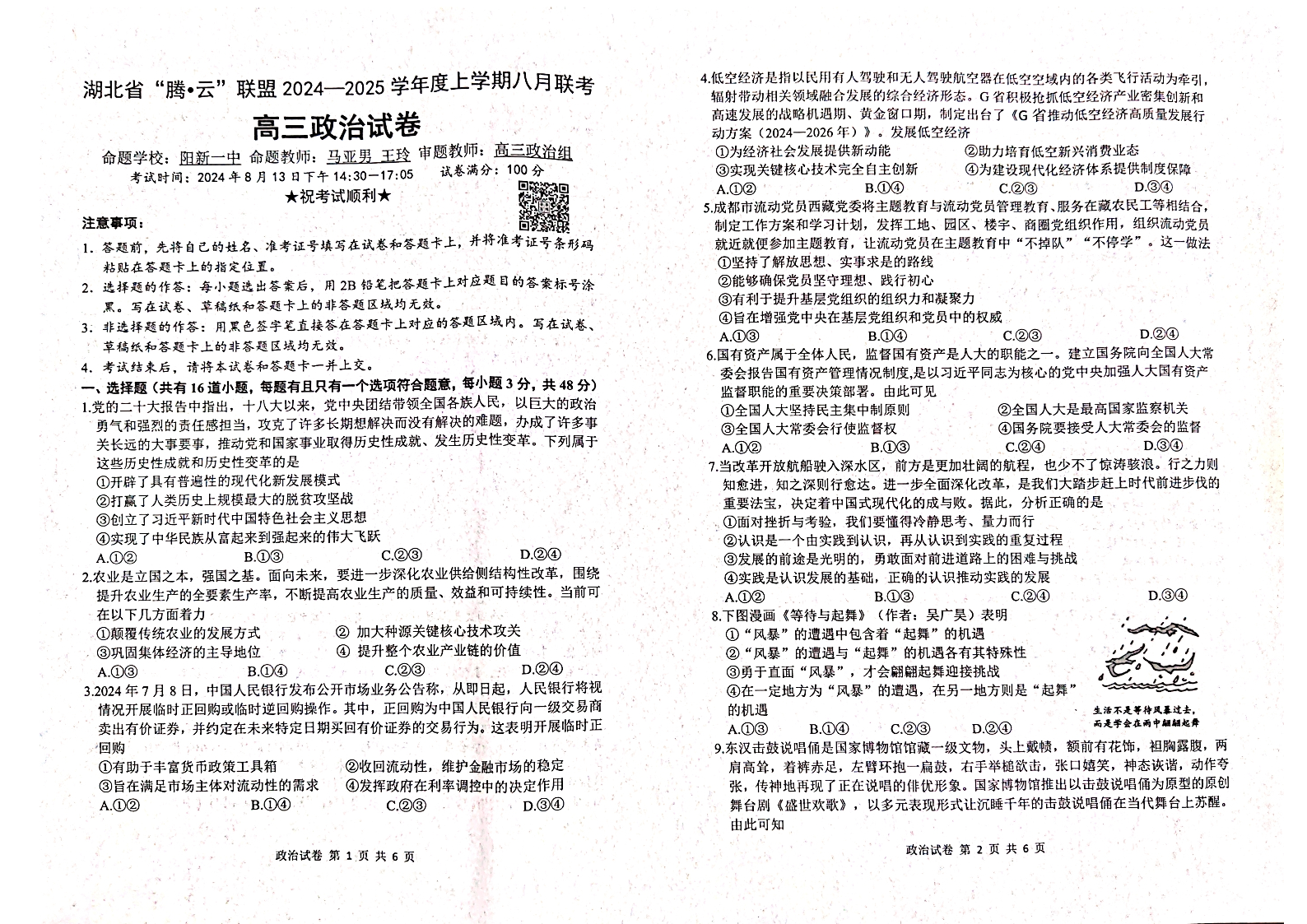 湖北省“腾·云”联盟2025届高三上学期八月联考 政治