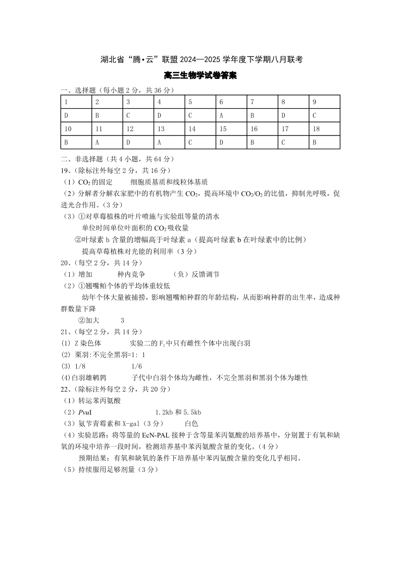 湖北省“腾·云”联盟2025届高三上学期八月联考 生物答案