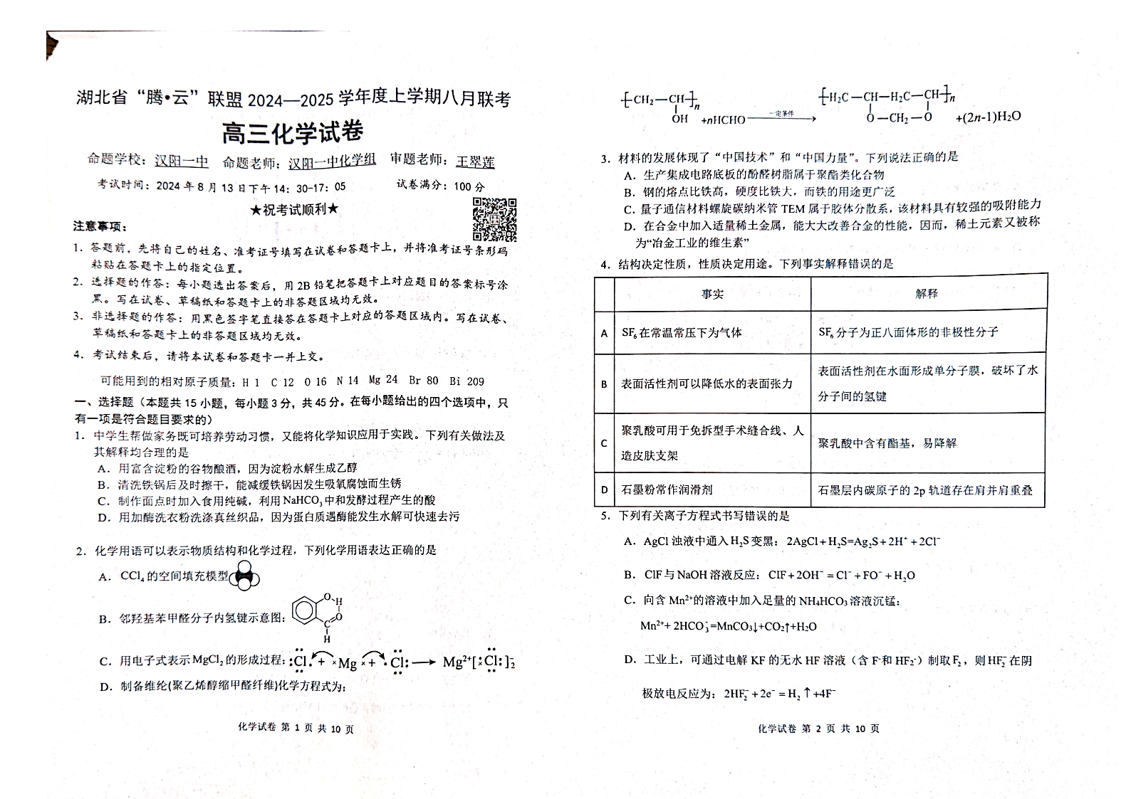 湖北省“腾·云”联盟2025届高三上学期八月联考 化学