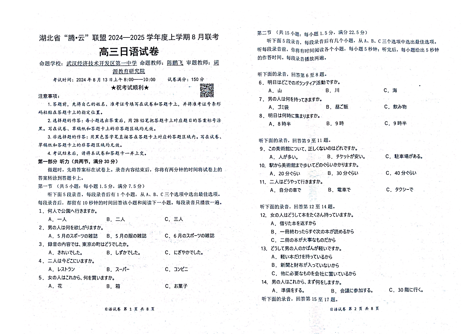 湖北省“腾·云”联盟2025届高三上学期八月联考 日语