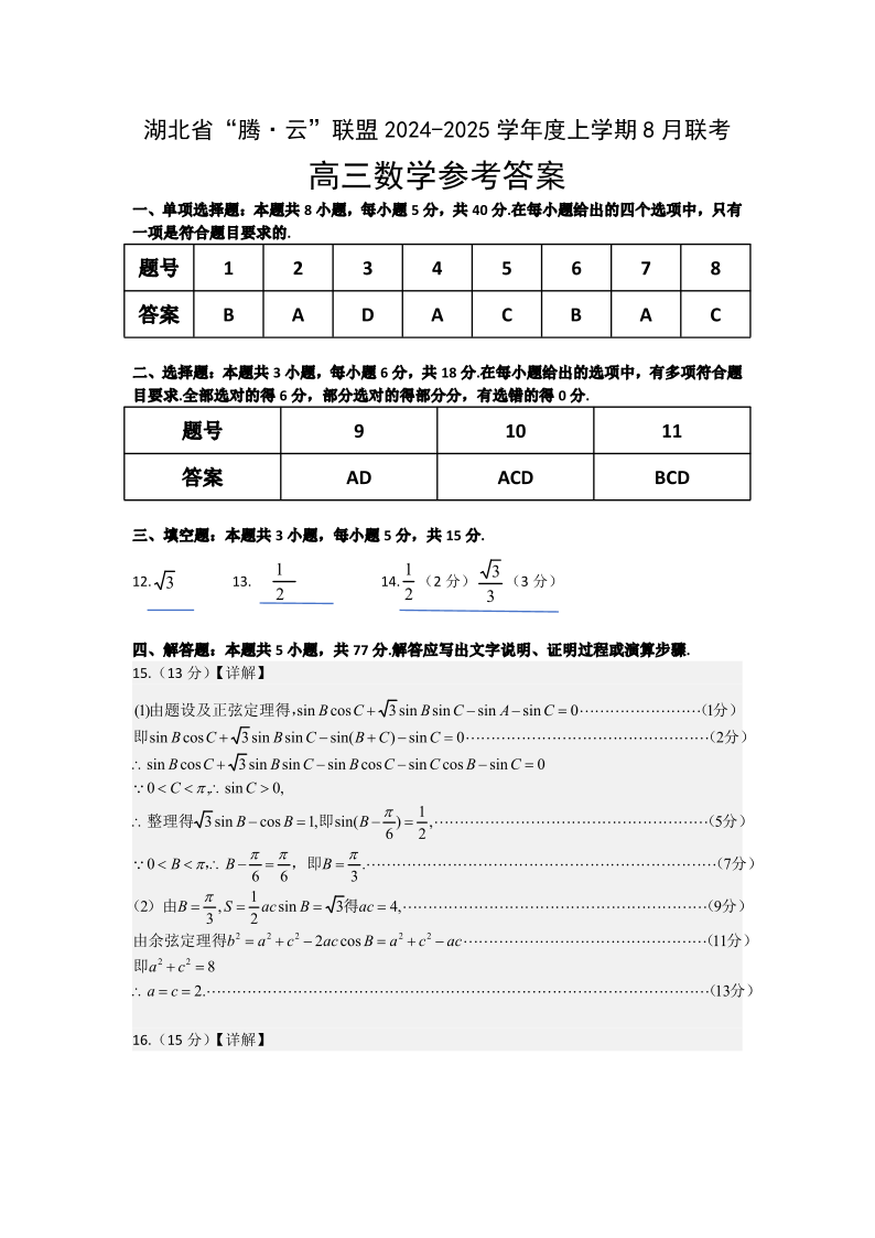 湖北省“腾·云”联盟2025届高三上学期八月联考 数学答案
