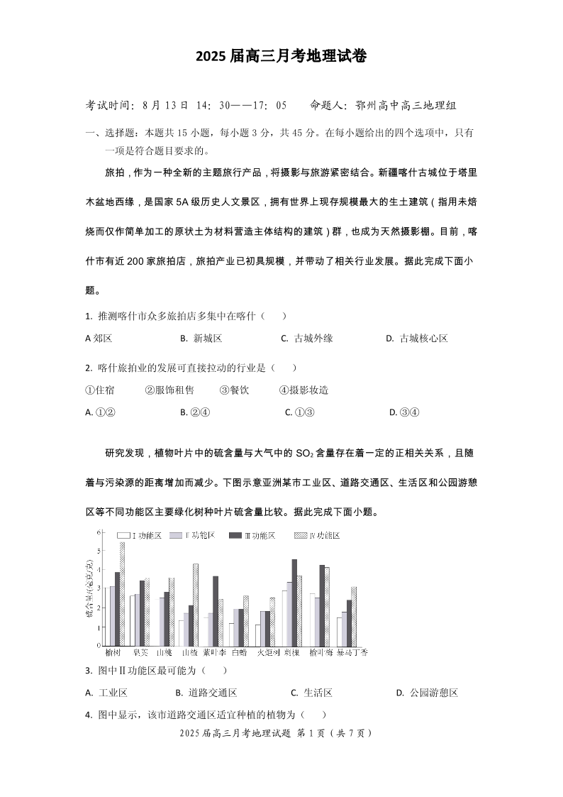 湖北省重点高中智学联盟2025届新高三8月联考考试 地理