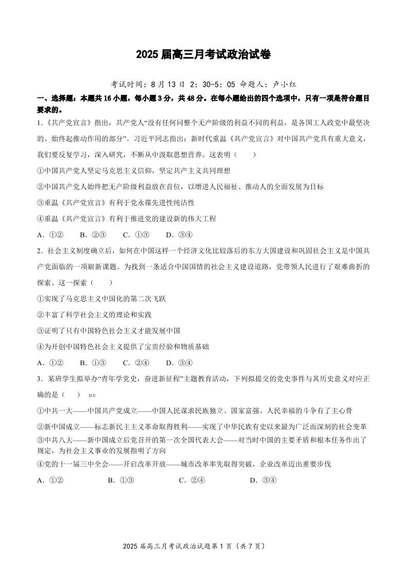 湖北省重点高中智学联盟2025届新高三8月联考考试 政治