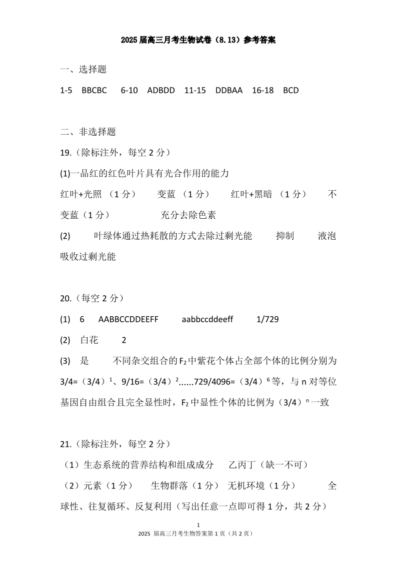 湖北省重点高中智学联盟2025届新高三8月联考考试 生物答案