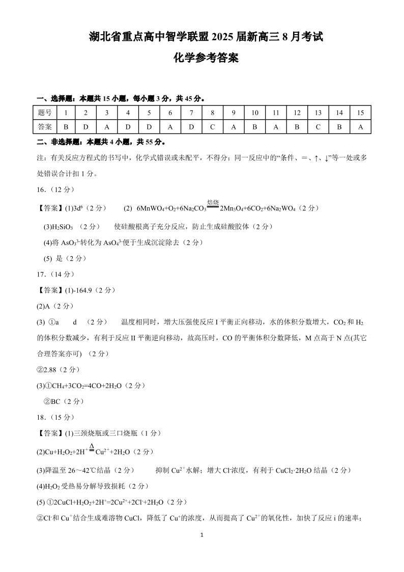 湖北省重点高中智学联盟2025届新高三8月联考考试 化学答案