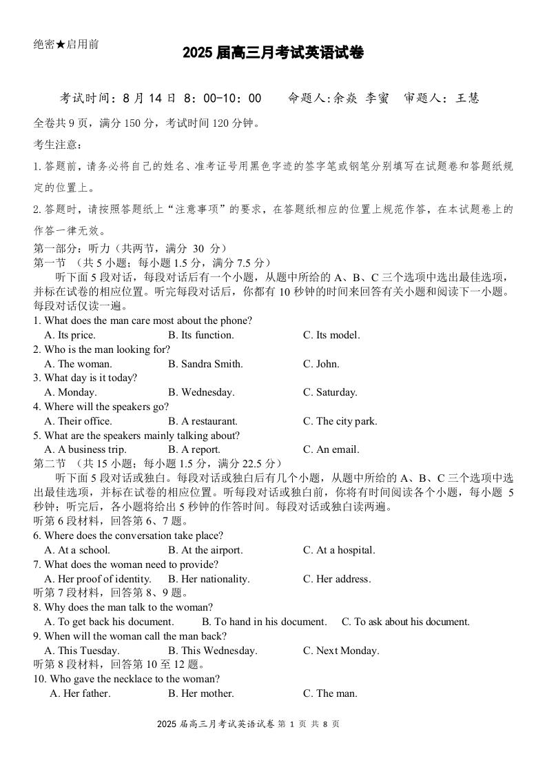 湖北省重点高中智学联盟2025届新高三8月联考考试 英语