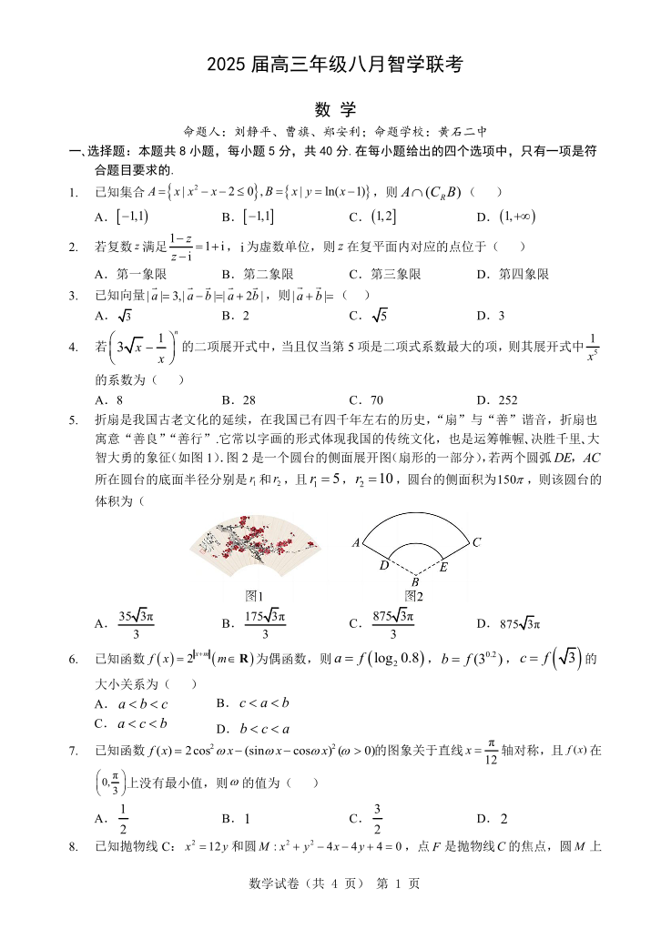 湖北省重点高中智学联盟2025届新高三8月联考考试 数学