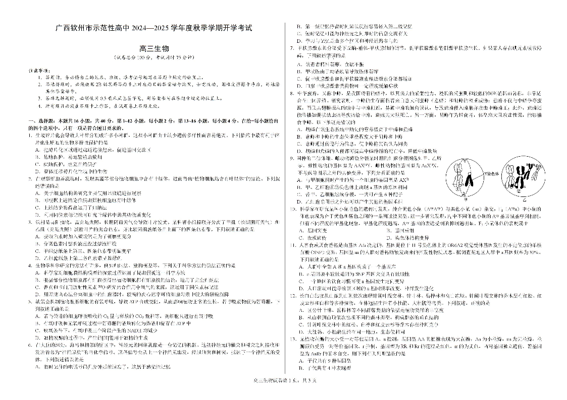 广西钦州市示范性高中2024-2025学年高三秋季开学考试 生物