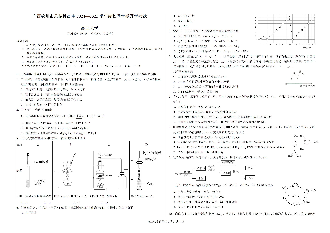 广西钦州市示范性高中2024-2025学年高三秋季开学考试 化学