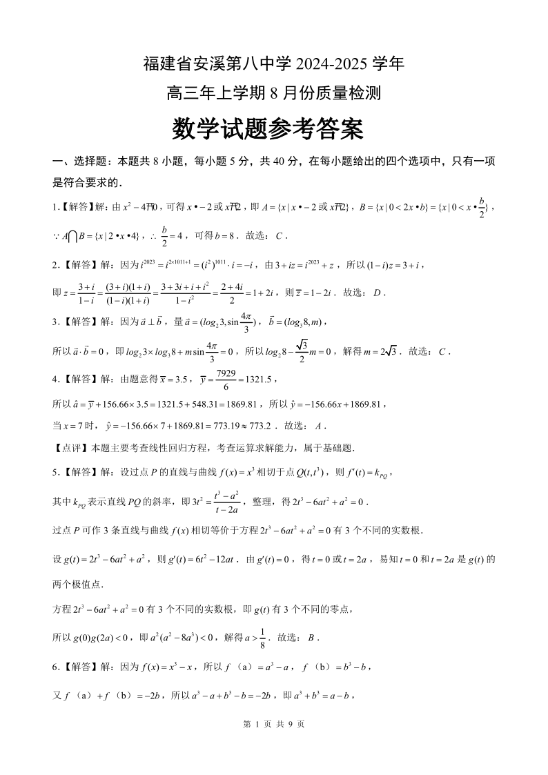 福建省安溪第八中学2024-2025学年高三年上学期8月份质量检测 数学试卷答案