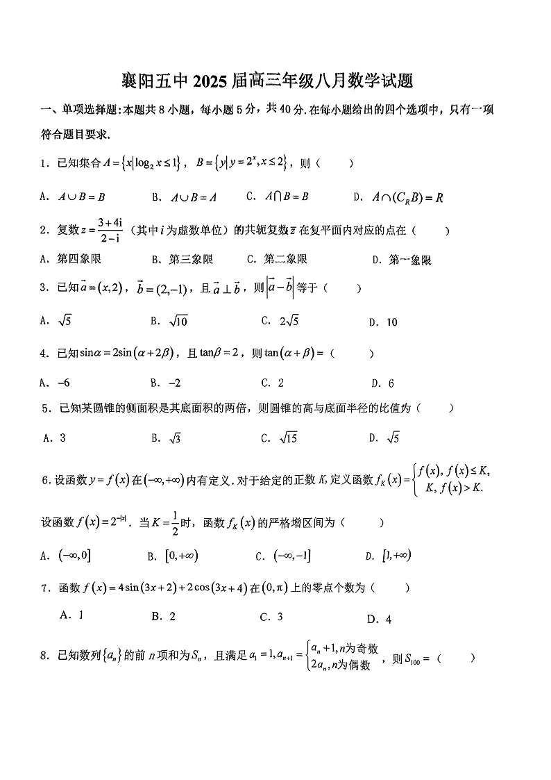 湖北省襄阳五中2025届高三年级八月月考数学试题