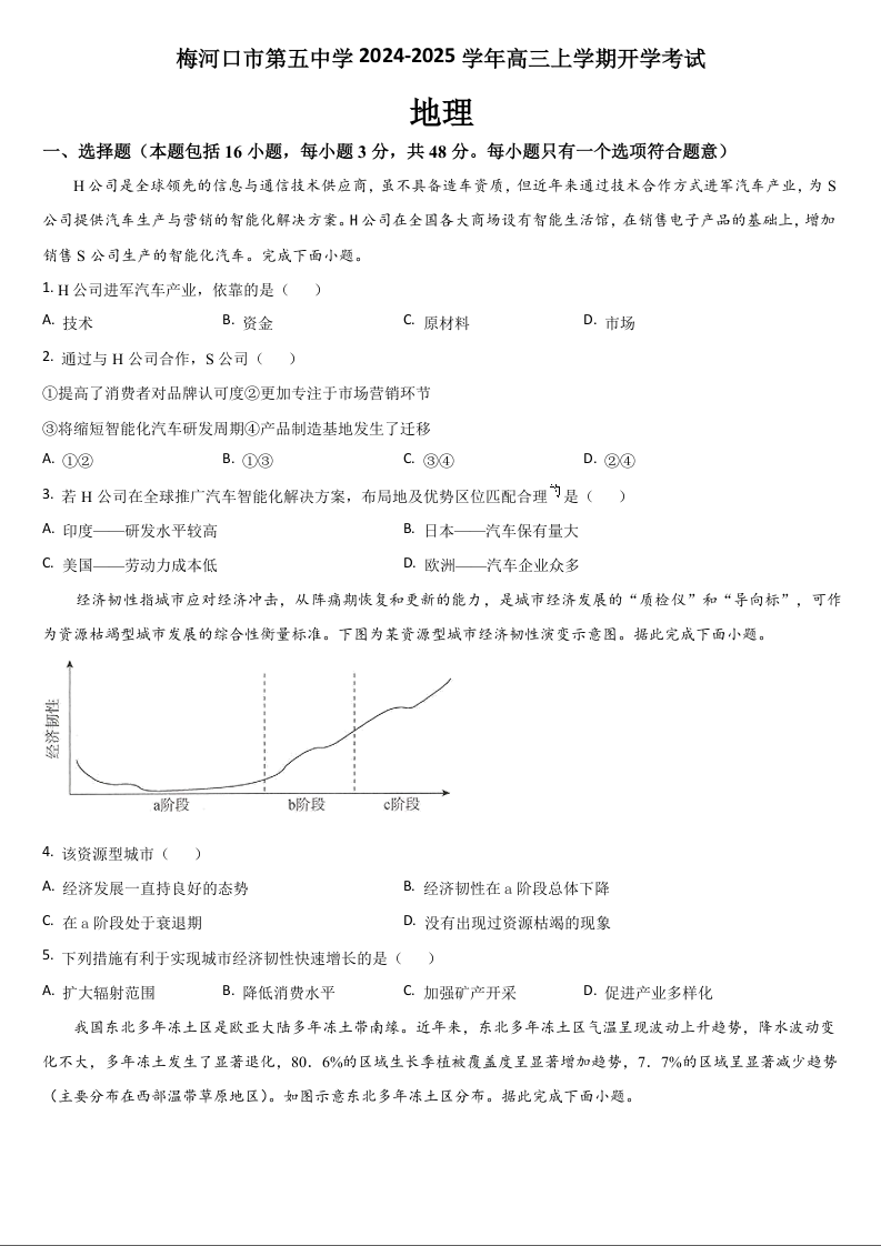 吉林省通化市梅河口市第五中学2024-2025学年高三上学期开学考试 地理