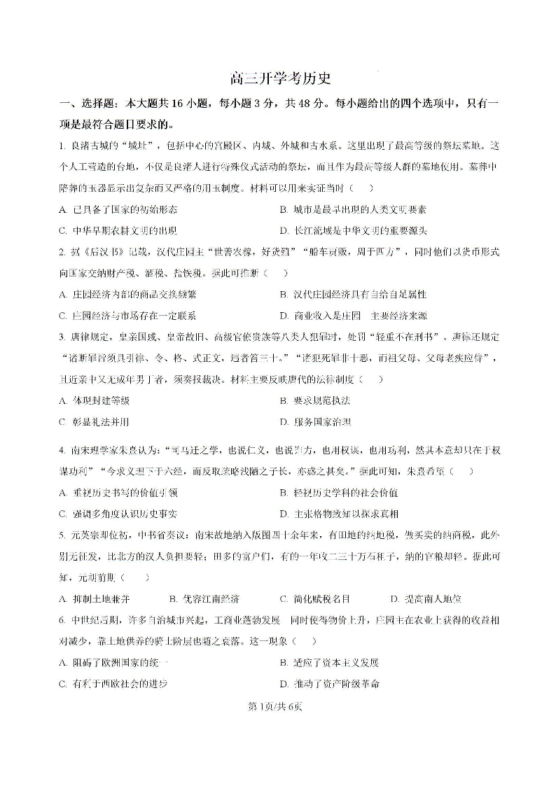 吉林省通化市梅河口市第五中学2024-2025学年高三上学期开学考试 历史