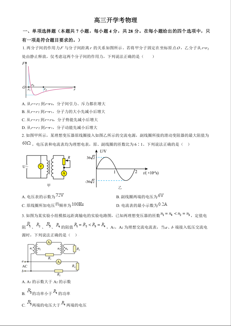 吉林省通化市梅河口市第五中学2024-2025学年高三上学期开学考试 物理