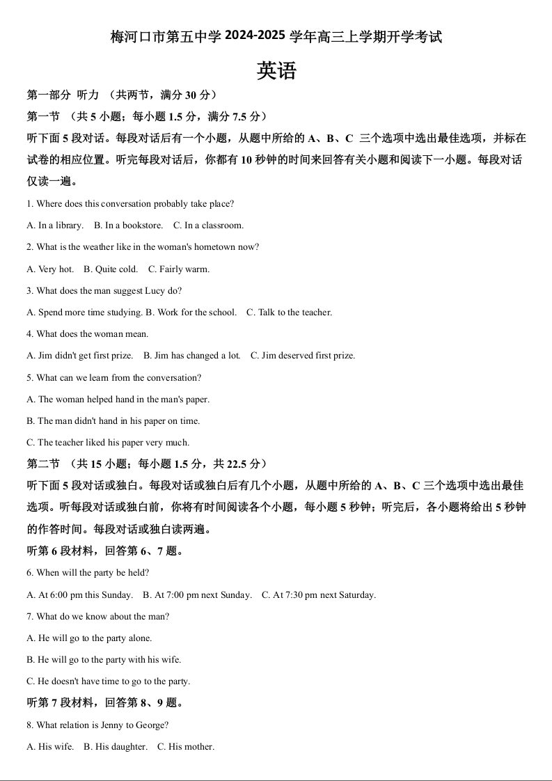 吉林省通化市梅河口市第五中学2024-2025学年高三上学期开学考试 英语