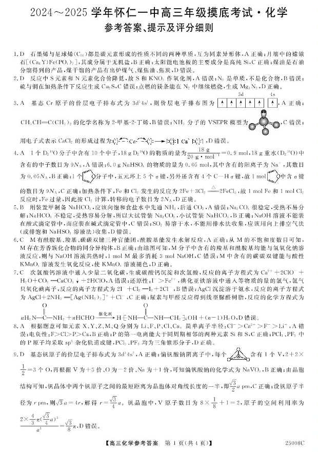 山西省朔州市怀仁市第一中学校2025届高三上学期摸底考试 化学答案