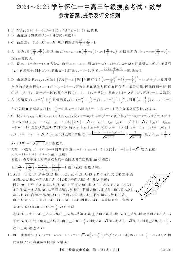 山西省朔州市怀仁市第一中学校2025届高三上学期摸底考试 数学答案
