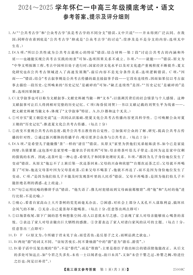 山西省朔州市怀仁市第一中学校2025届高三上学期摸底考试 语文答案