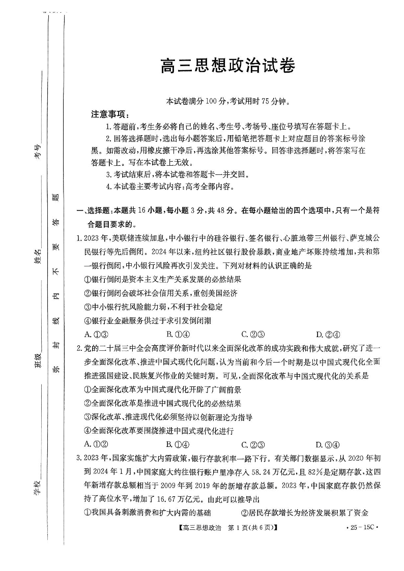 贵州省黔东南苗族侗族自治州2024-2025学年高三上学期开学考试 政治