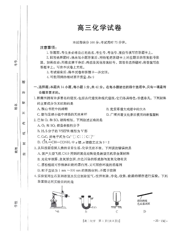 贵州省黔东南苗族侗族自治州2024-2025学年高三上学期开学考试 化学