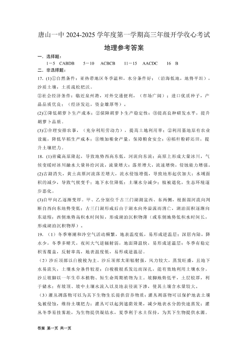 河北省唐山市第一中学2024-2025学年高三上学期开学收心考试 地理答案