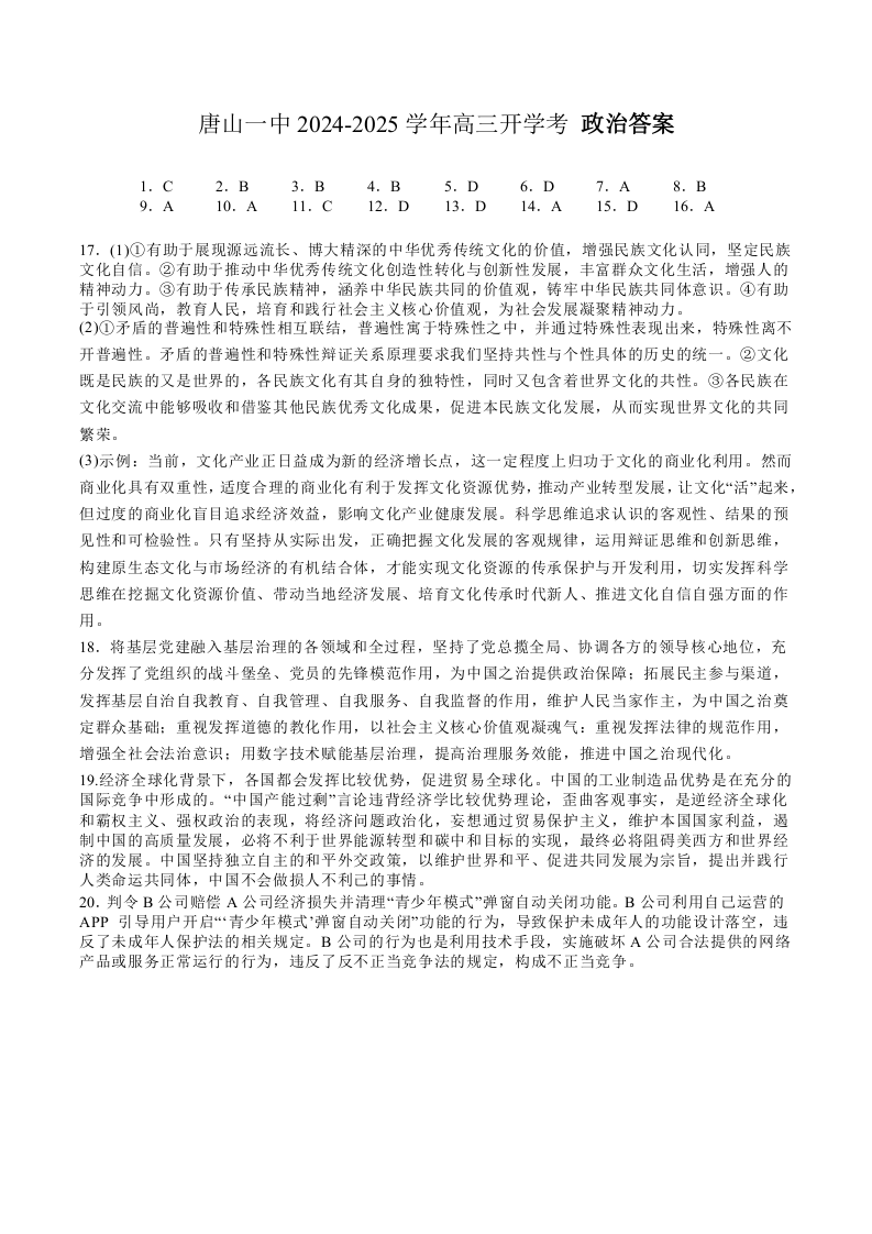 河北省唐山市第一中学2024-2025学年高三上学期开学收心考试 政治答案