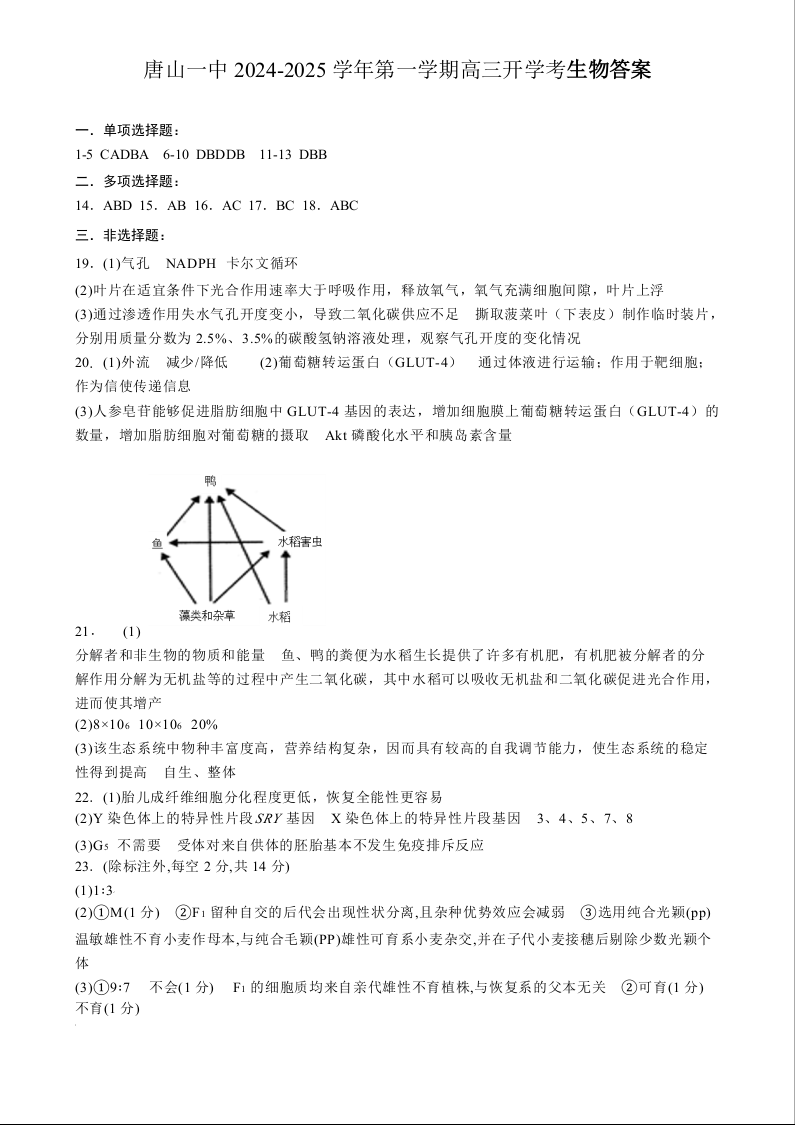河北省唐山市第一中学2024-2025学年高三上学期开学收心考试 生物答案