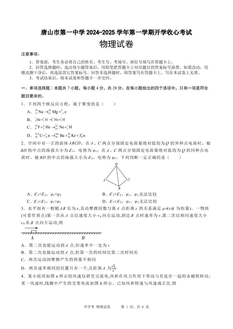 河北省唐山市第一中学2024-2025学年高三上学期开学收心考试 物理