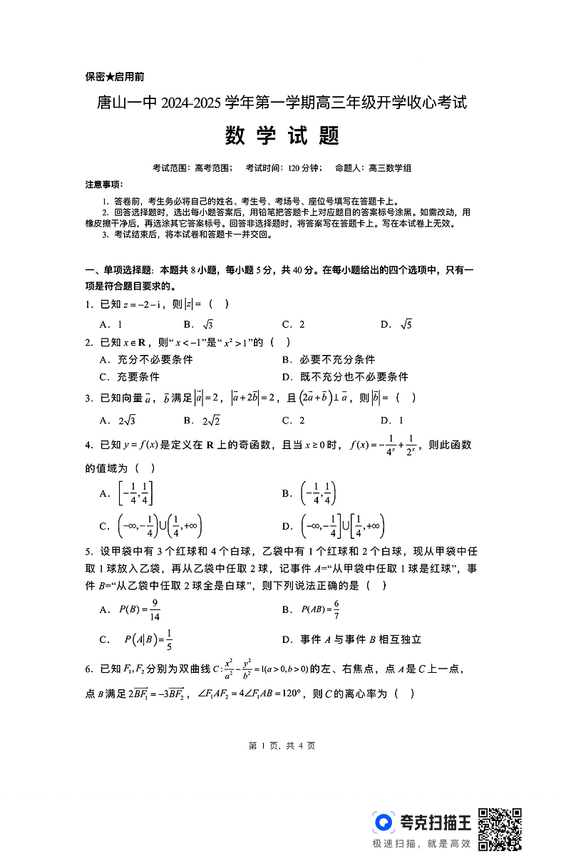 河北省唐山市第一中学2024-2025学年高三上学期开学收心考试 数学