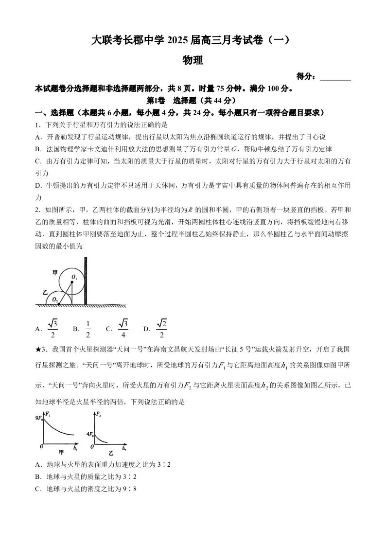湖南省长郡中学2025届高三年级月考试卷(一)物理