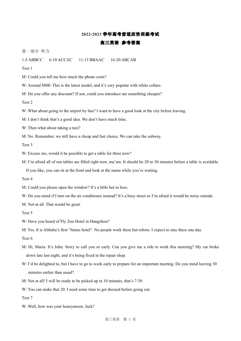 2023届河北省高三下学期高考前适应性考试英语答案