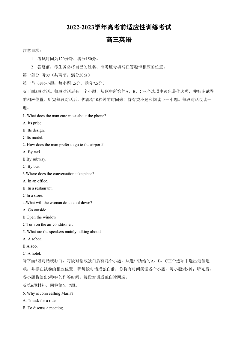 2023届河北省高三下学期高考前适应性考试英语