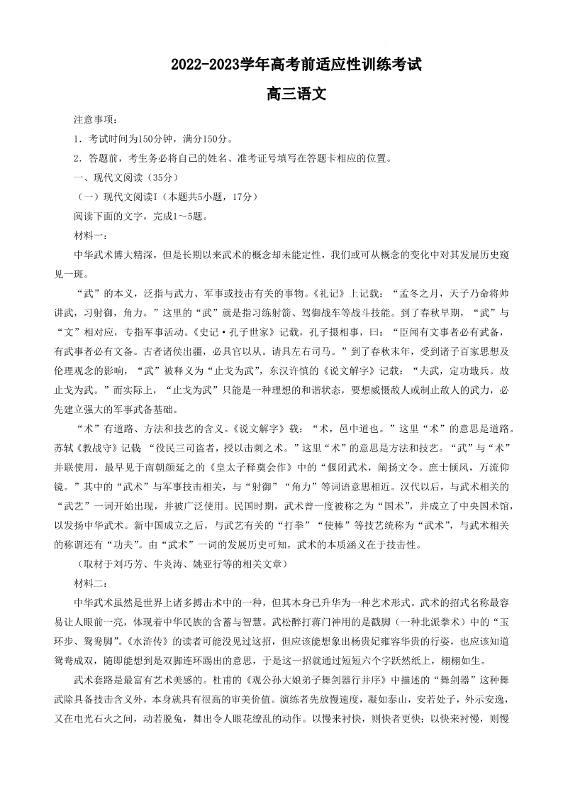 2023届河北省高三下学期高考前适应性考试语文