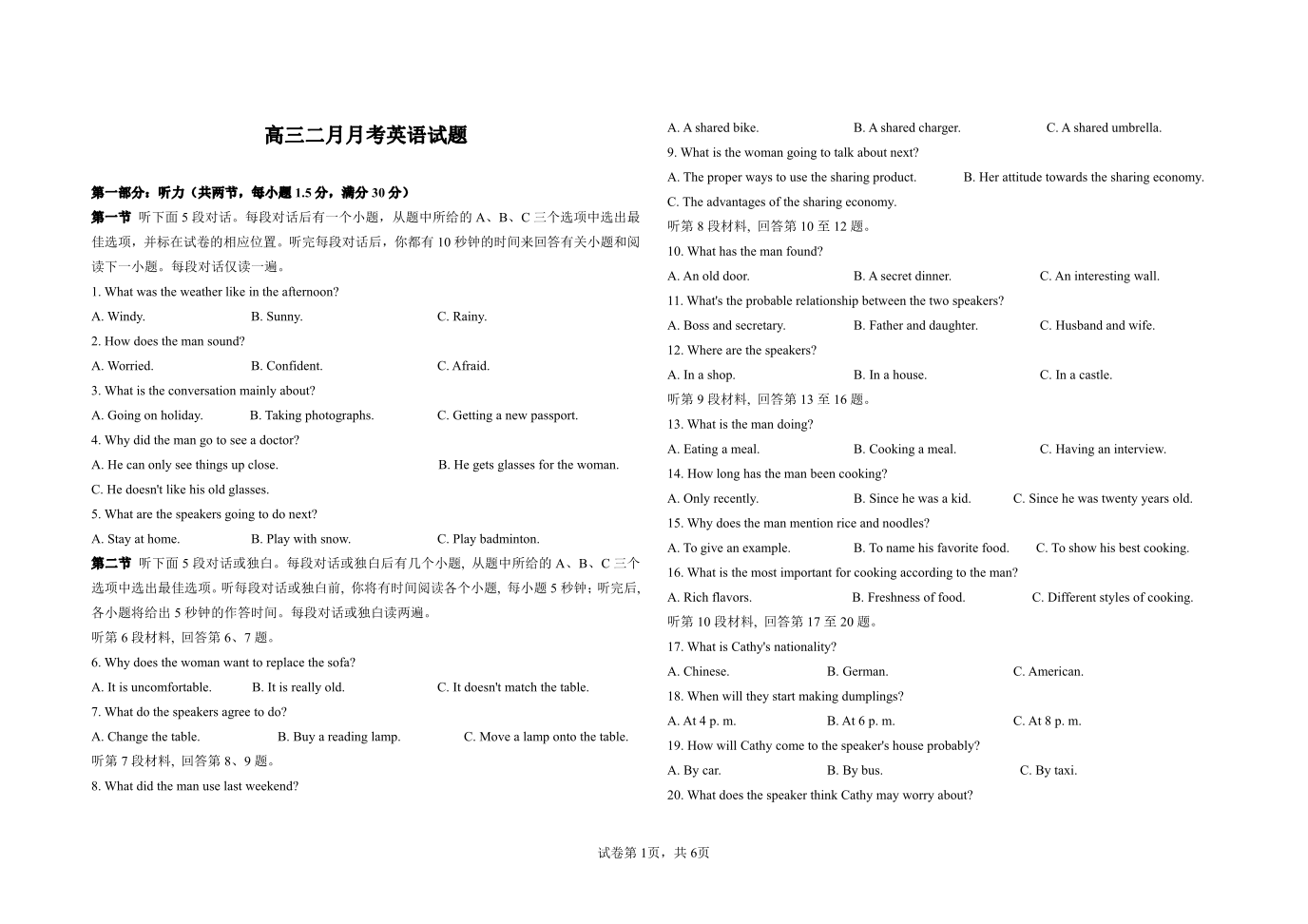 河北省邯郸市大名县第一中学2022-2023学年高三下学期2月月考英语试题